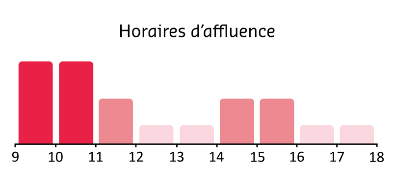 Afin de vous aider, vous trouverez ci-dessous un schéma indiquant les heures d’affluence : il vous permettra de choisir le bon créneau et d’éviter une trop longue attente.